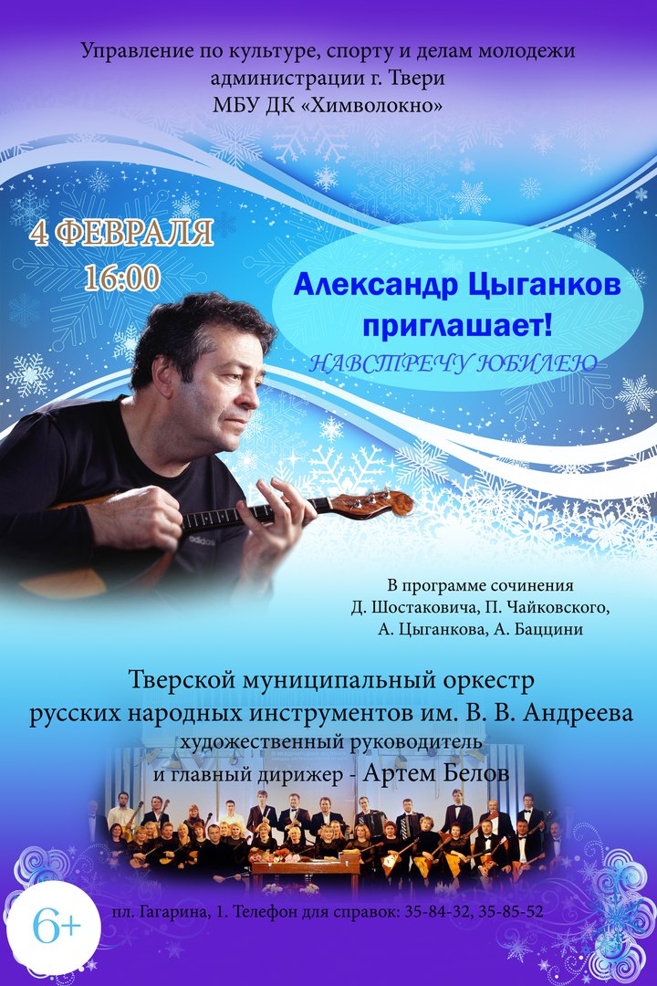 4 февраля во Дворце культуры «Химволокно» состоится концерт Народного артиста РФ, профессора, лауреата Государственной премии Александра Цыганкова.