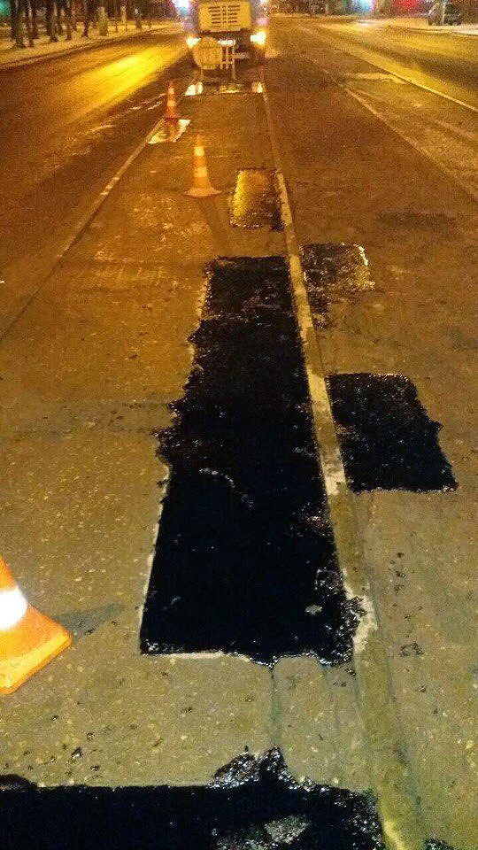 Зимой при ремонте дорог используется литой асфальтобетон – его можно укладывать даже при минусовой температуре. Материал привозят из Москвы в специальном термосе-бункере, предназначенном для транспортировки литого асфальта. По технологии сначала готовятся так называемые карты – срезается верхний слой асфальта на проблемном участке, вычищается и просушивается. Затем карту заливают асфальтобетоном. Основные работы производят ночью, чтобы не затруднять движение транспорта.