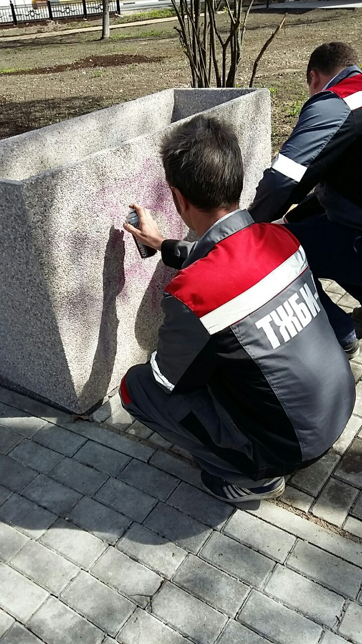 В первых числах мая на одну из цветочниц неизвестными лицами было нанесено граффити сиреневой краской. Ситуация осложнялась тем, что обычный метод борьбы с подобными надписями – закрашивание краской подходящего цвета – непригоден для декоративного бетона, чья специфика – именно в поверхности, имитирующей натуральный камень. Специалистами АО «ТЖБИ-4» было в кратчайшие сроки подобрано необходимое химическое средство, при помощи которого граффити было удалено с поверхности цветочницы без какого-либо ущерба для её внешнего вида.
