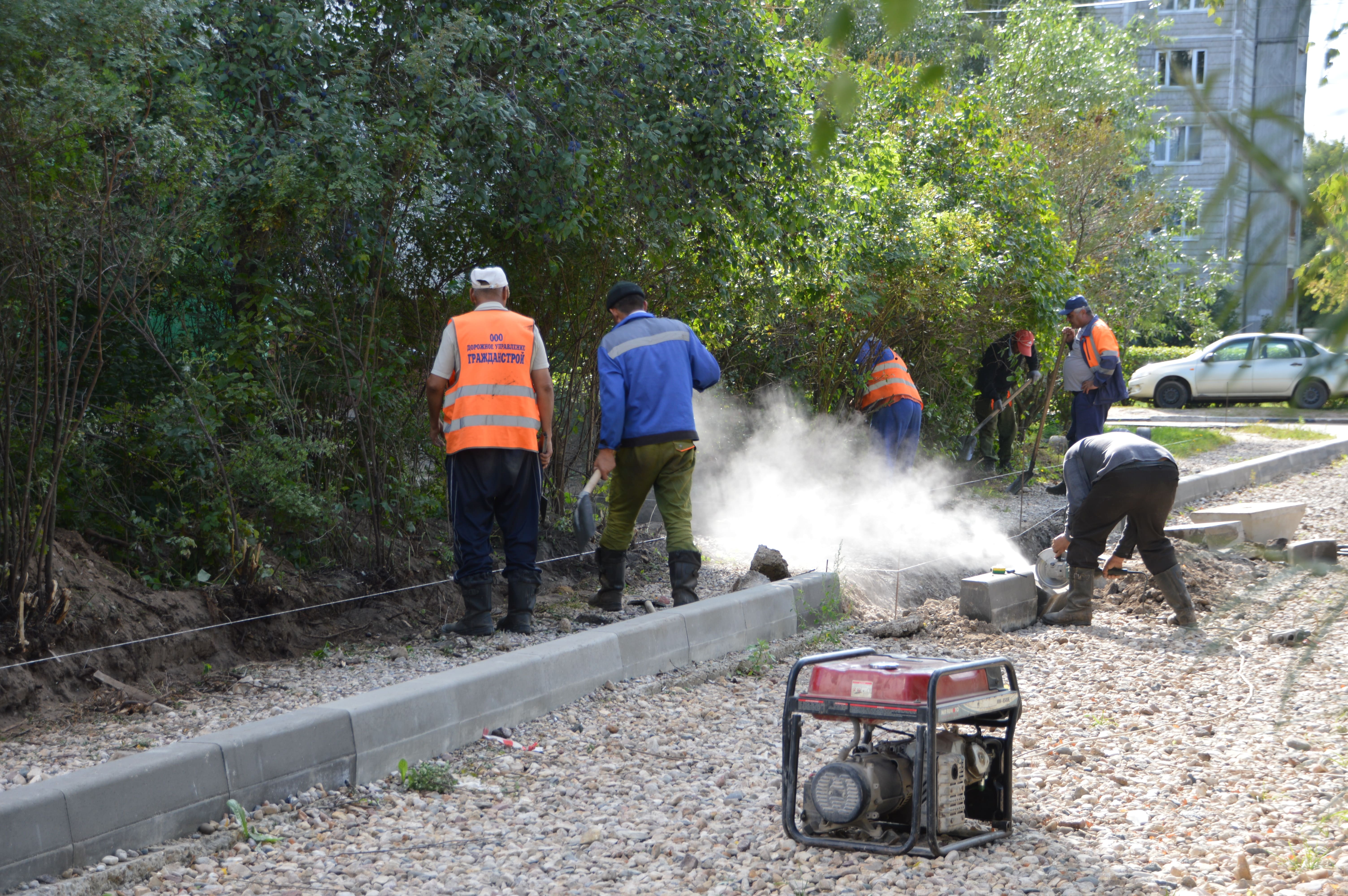 На бульваре Ногина, 10 корпус 1 и 2 рабочие укладывают бортовой камень возле подъездов. Затем в планах подрядчика заасфальтировать тротуары и приступить к основной площадке. После этого будет приведена в порядок зеленая зона, где располагается детская площадка. Здесь предусмотрены тротуары, которые будут смыкаться по круговому радиусу, чтобы дети могли кататься на велосипедах, а молодые мамы гулять с колясками.