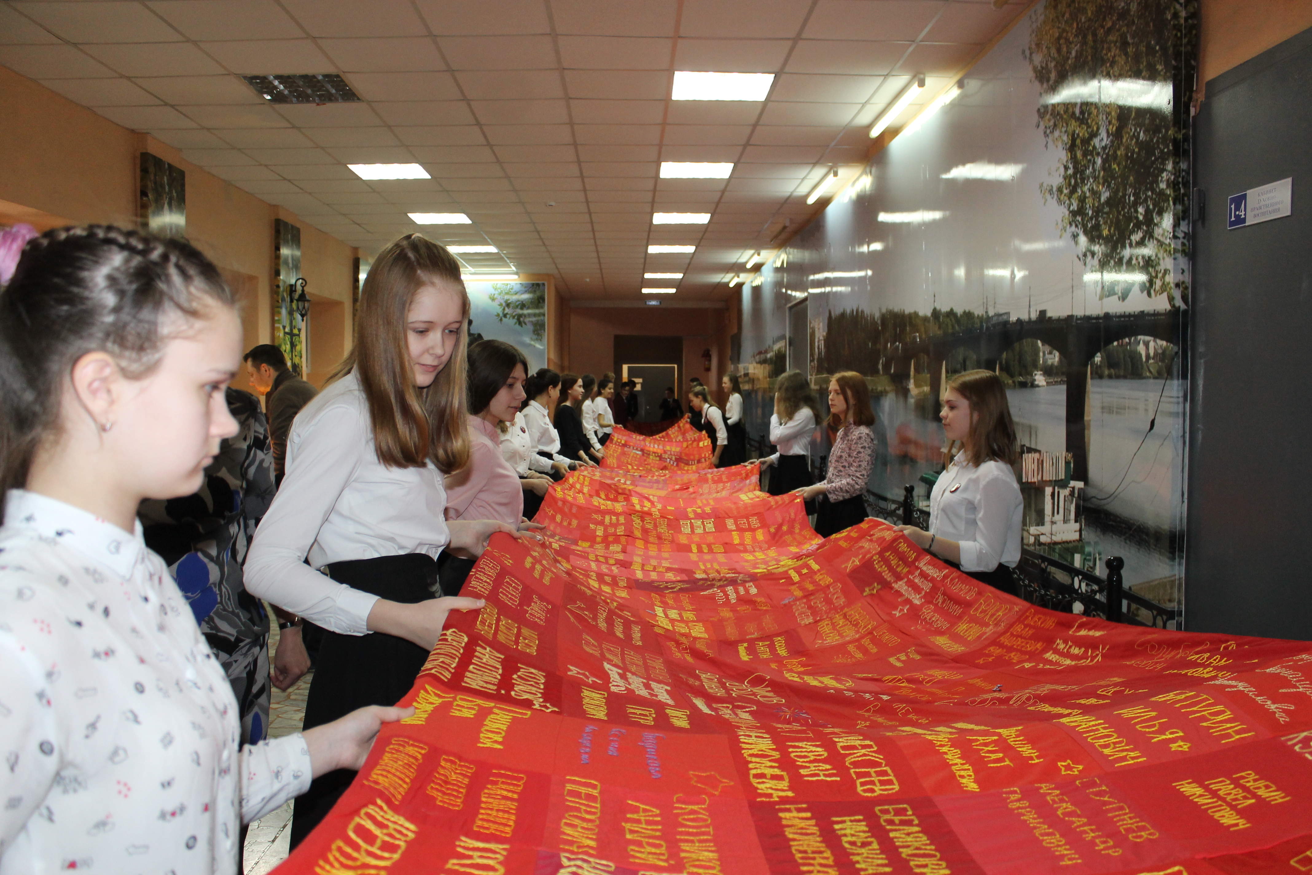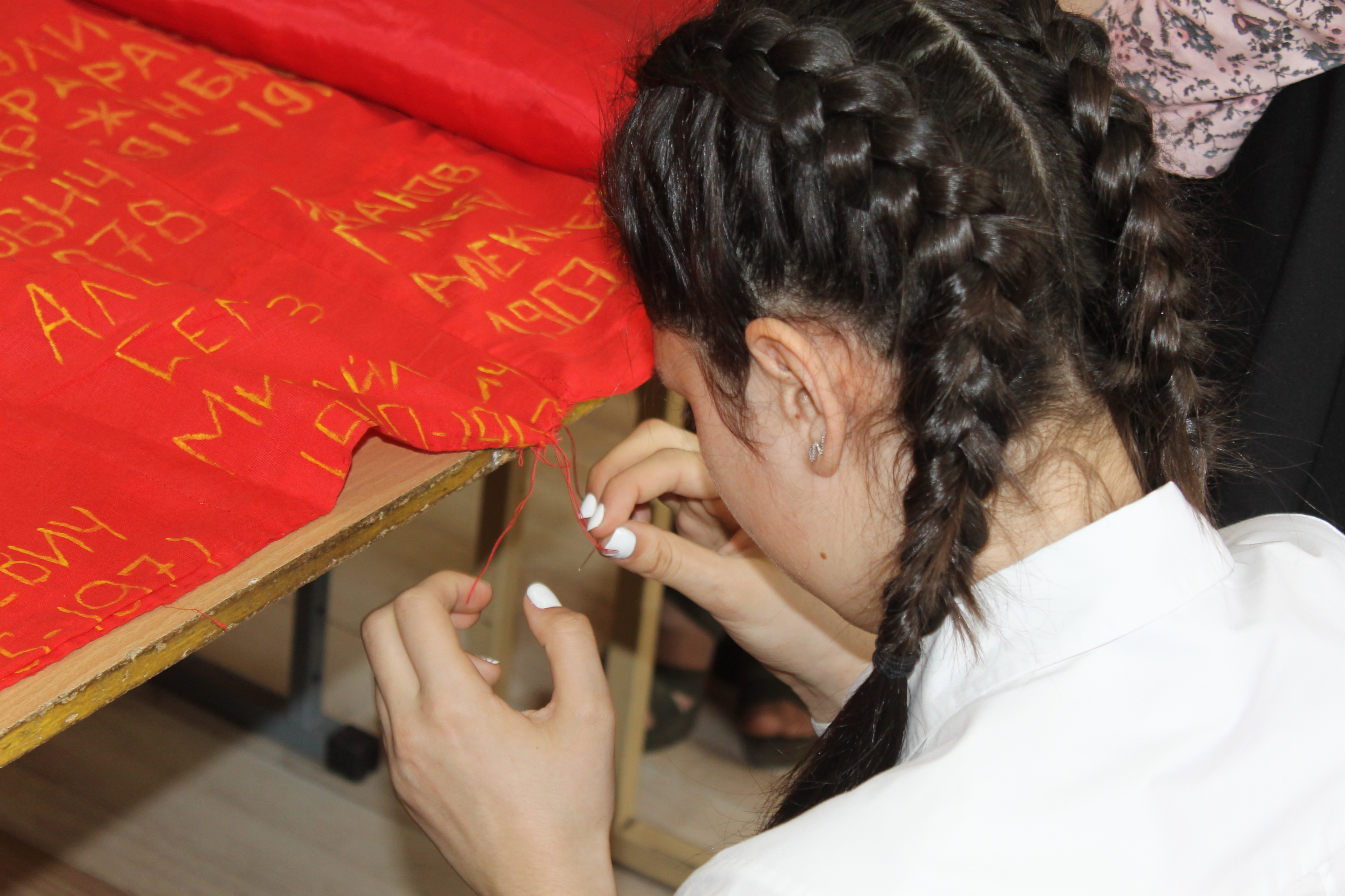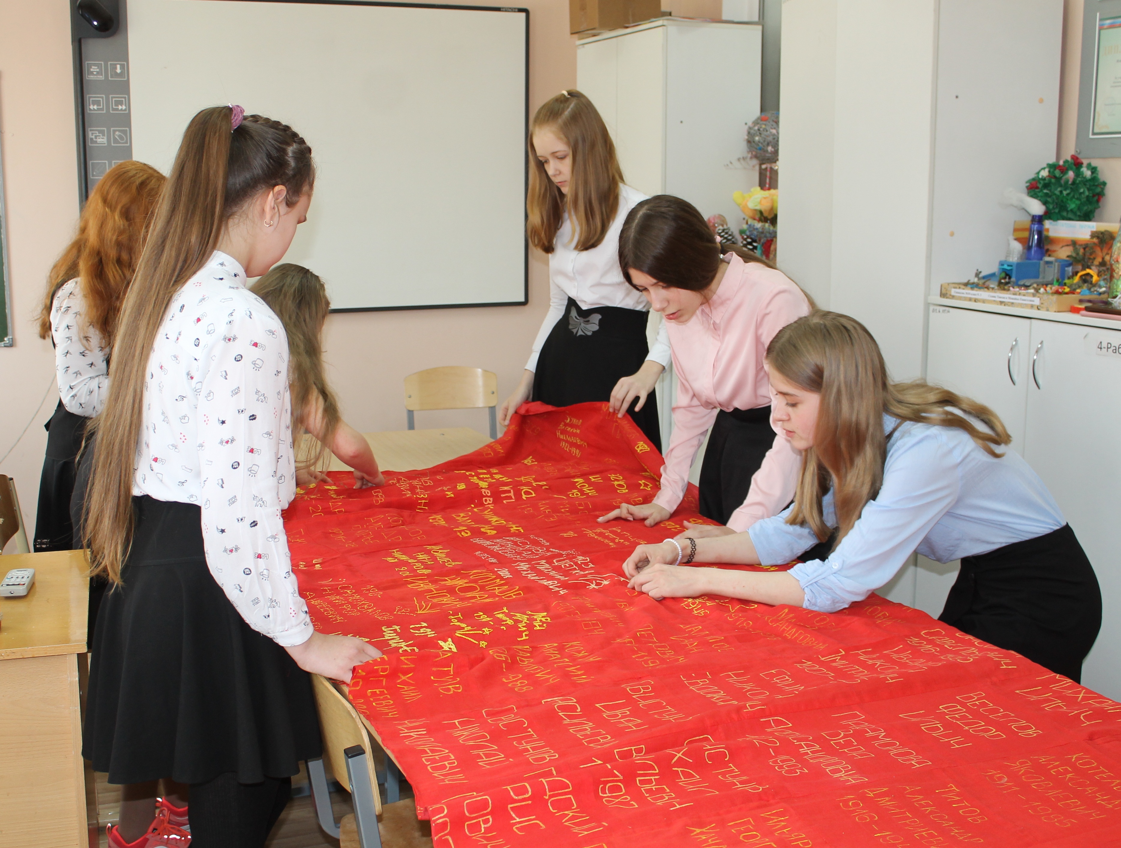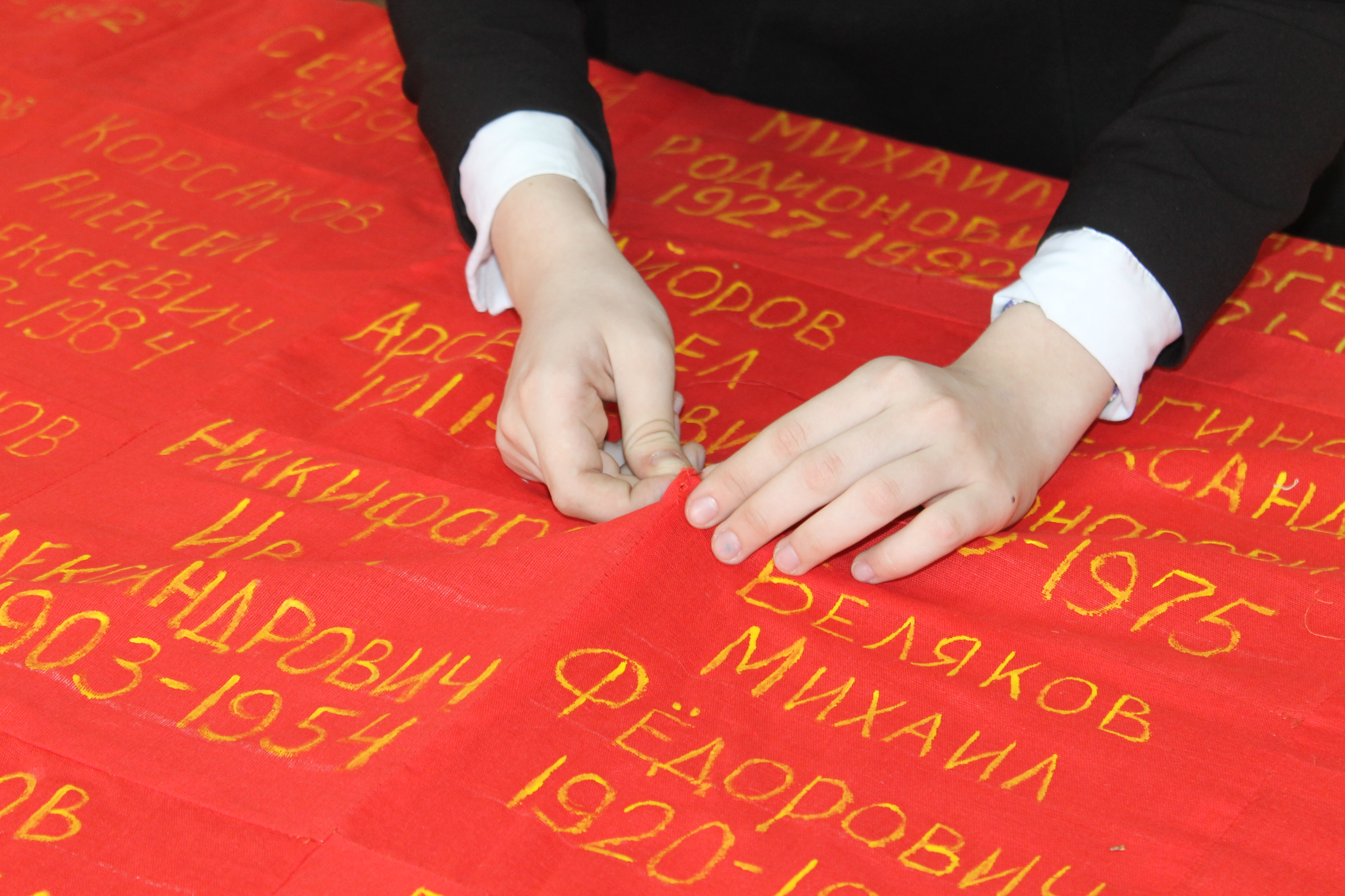 – О начале акции «Полотно памяти» мы объявили в своей гимназии, – делится воспоминаниями заместитель директора по воспитательной работе гимназии № 10 Светлана Андреева. – Школьники вышивали солдатские платки, приносили сюда, сшивали между собой и отвозили в 34-ю школу, где уже формировалось Полотно.