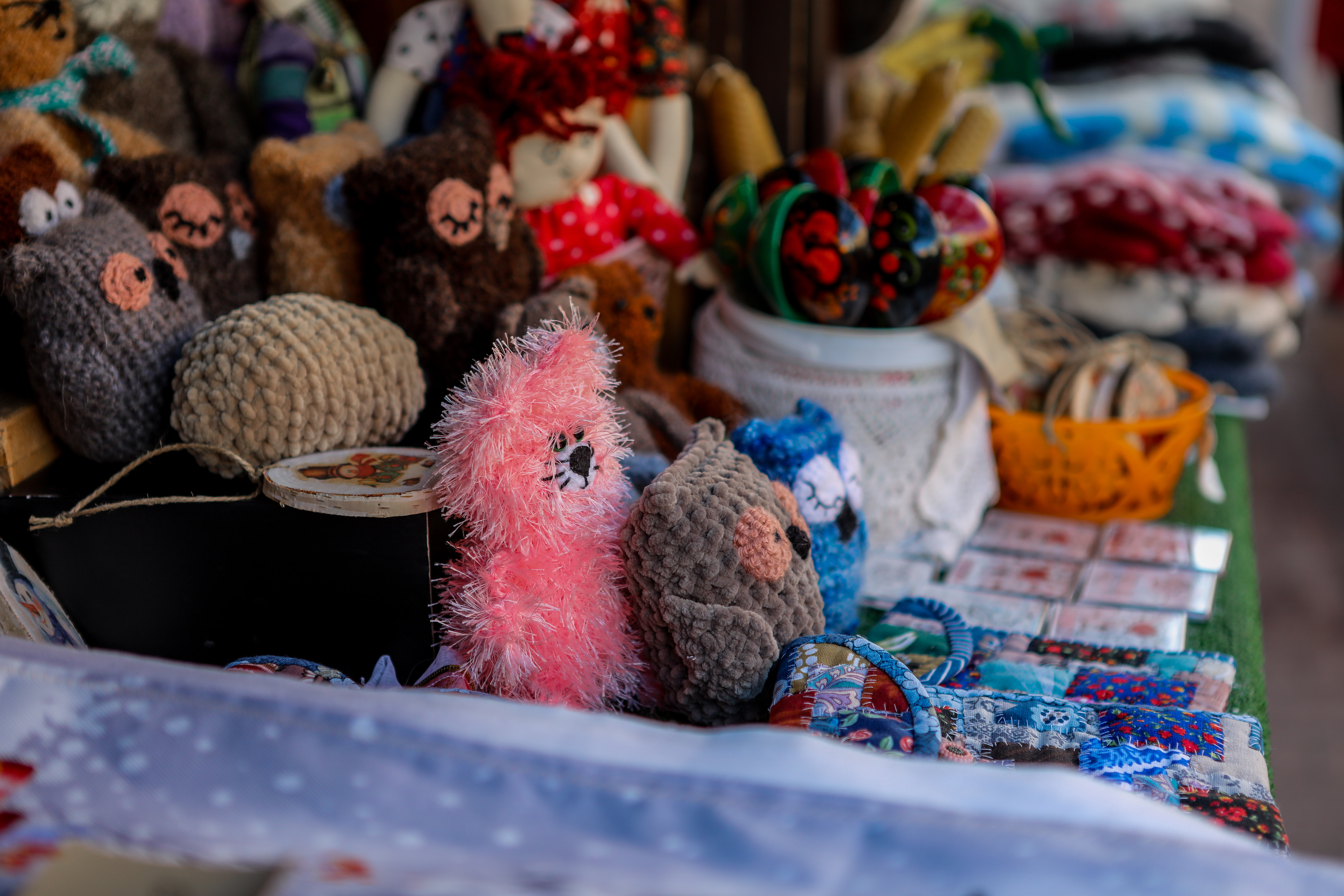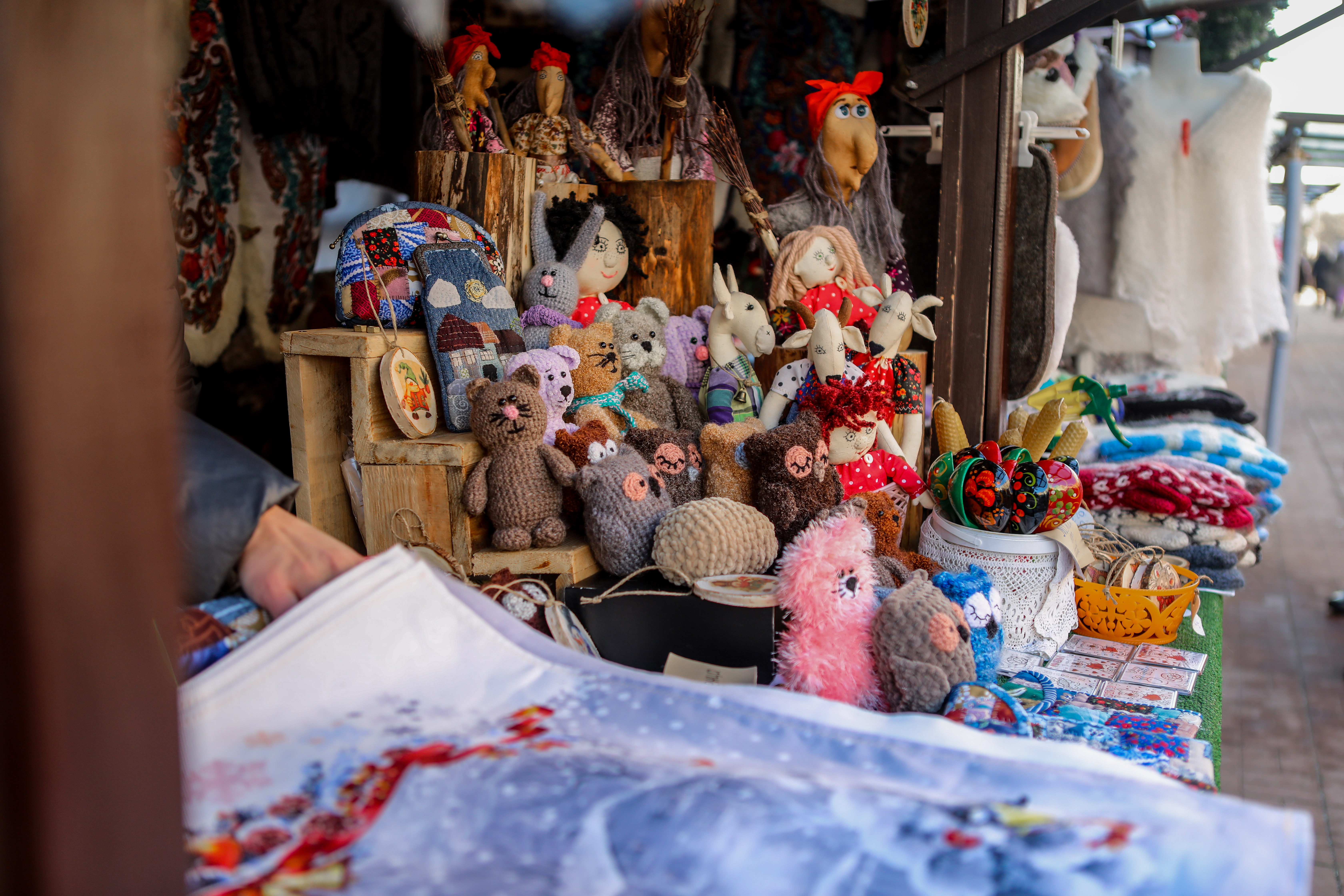 На ярмарке представлена продукция тверских производителей. Посетители могут приобрести ёлочные игрушки, новогодние сувениры, изделия ручной работы.