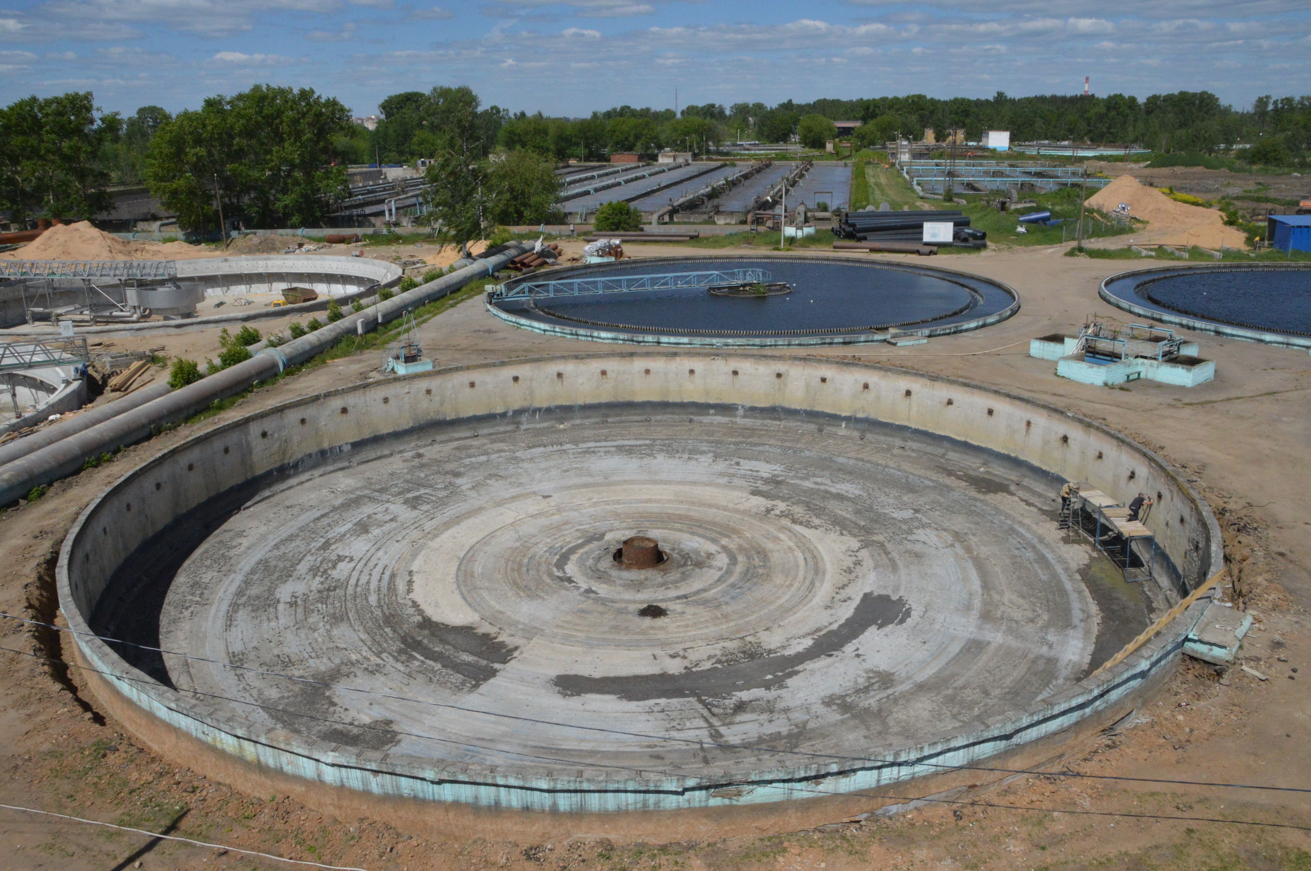Активно ведутся работы и на вторичных отстойниках. Всего на очистных сооружениях их десять, на сегодняшний день очистка воды в обычном режиме проводится в шести из них. Из остальных четырёх два практически готовы – полностью заменены железобетонные и металлические конструкции, частично установлено новое оборудование. Ещё два находятся в работе на разных степенях готовности. После запуска в эксплуатацию модернизированных отстойников в ремонт будут выведены поочерёдно выводиться оставшиеся шесть.