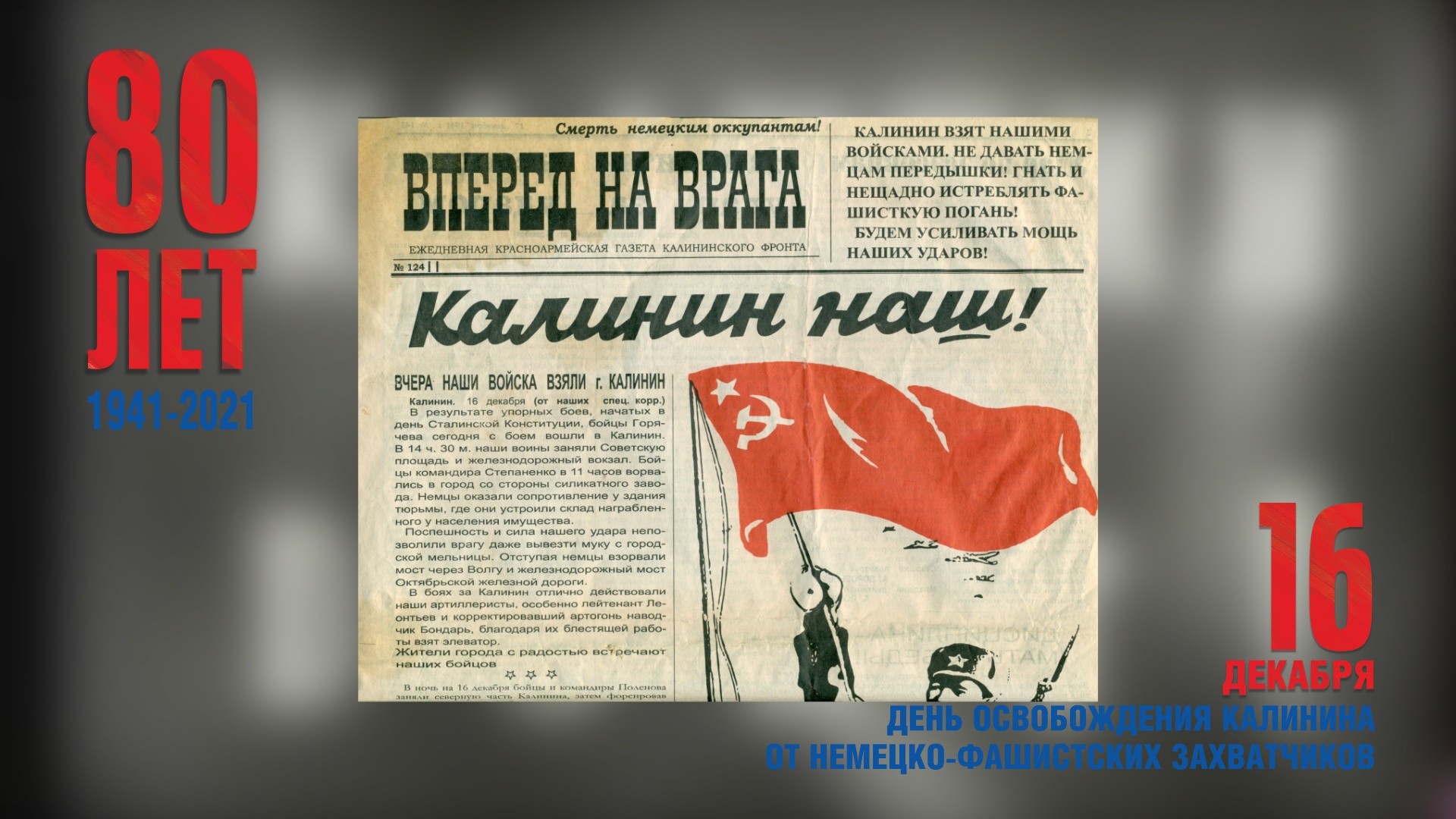 В День 80-летия освобождения Калинина от немецко-фашистских захватчиков в социальных сетях администрации Твери и на телеканале «Тверской проспект. Регион» пройдет праздничный концерт, в котором примут участие тверские исполнители, творческие коллективы, историки и краеведы.