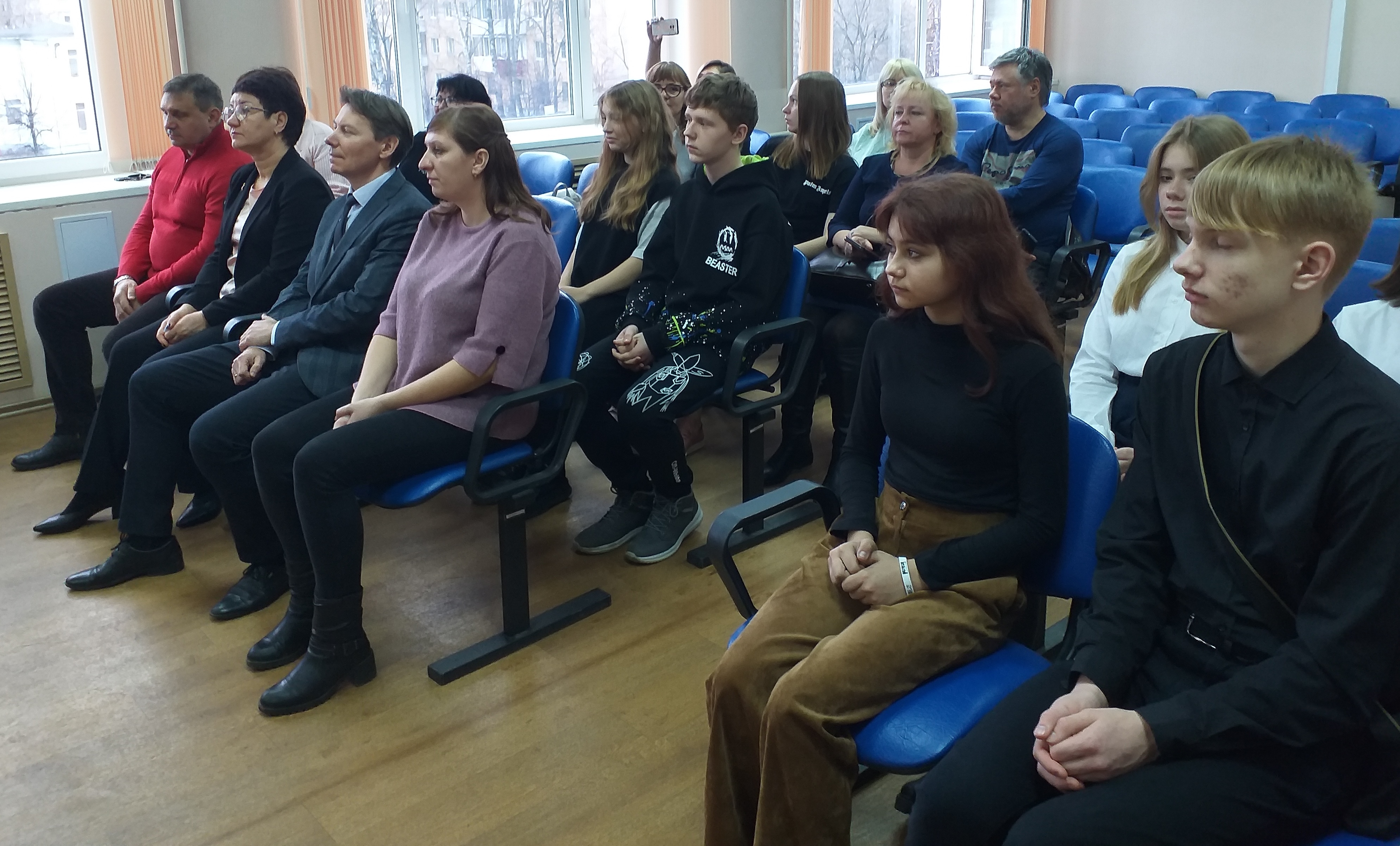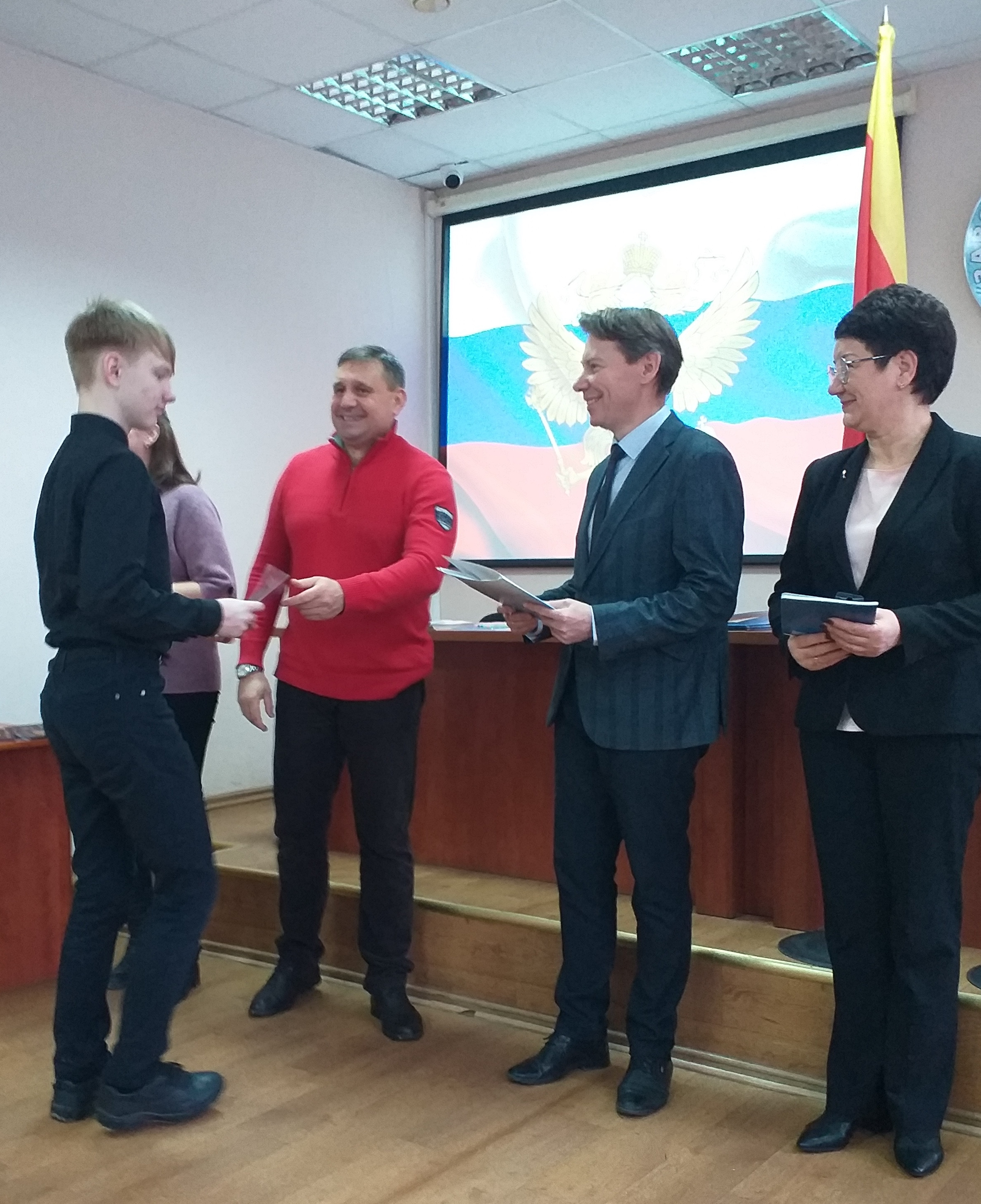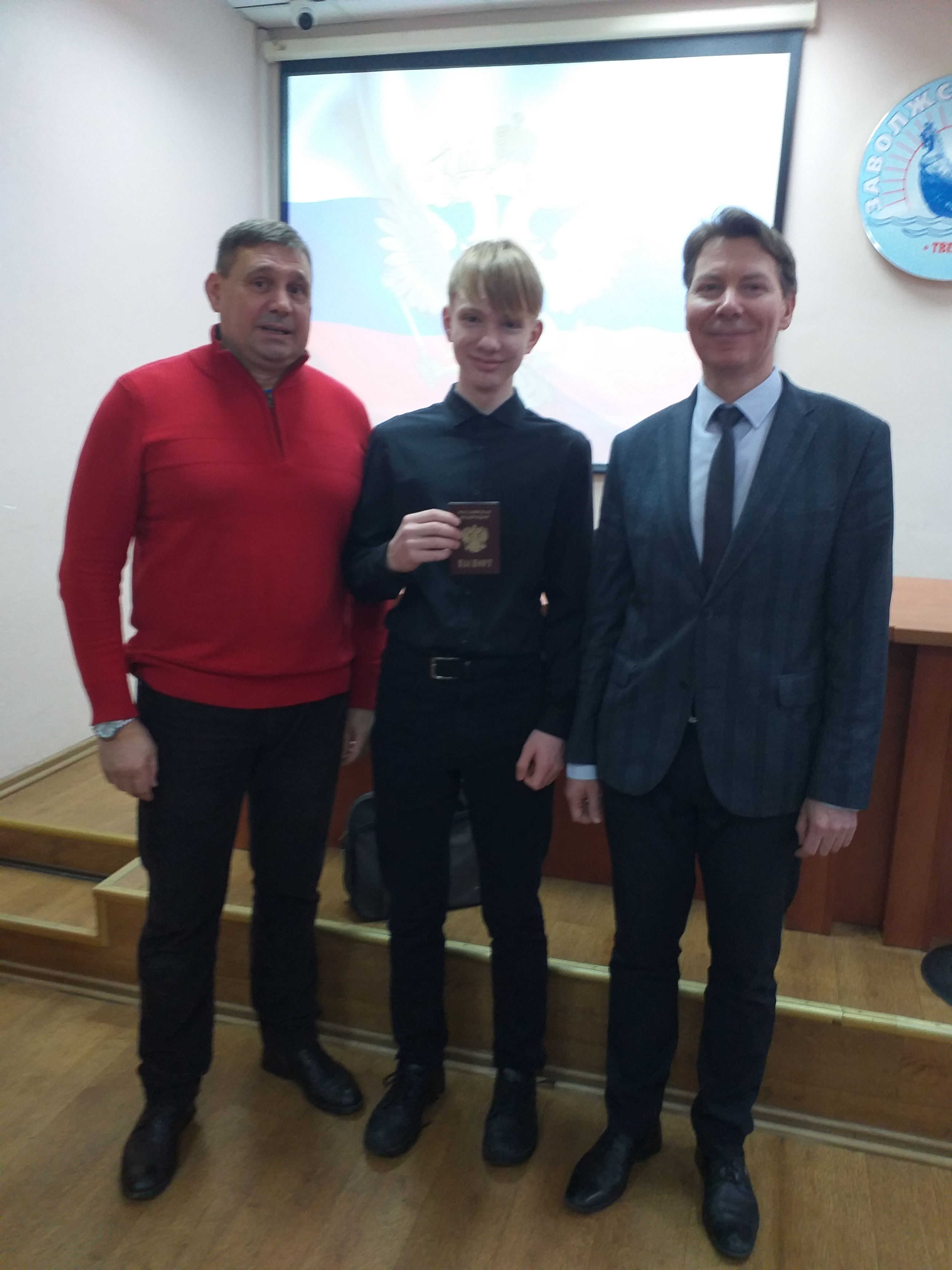 На церемонии вручения паспортов ребят поздравляли: заместитель главы администрации Заволжского района в городе Твери Роман Станиславович Чеканов, председатель избирательной комиссии Заволжского района в городе Твери Елена Анатольевна Курова, ведущий специалист эксперт отдела по вопросам миграции Заволжского отдела полиции УМВД России по городу Твери Ольга Юрьевна Санаева, член областного комитета Тверской общественной организации «Российский союз молодежи» Дмитрий Владимирович Аксельрод.