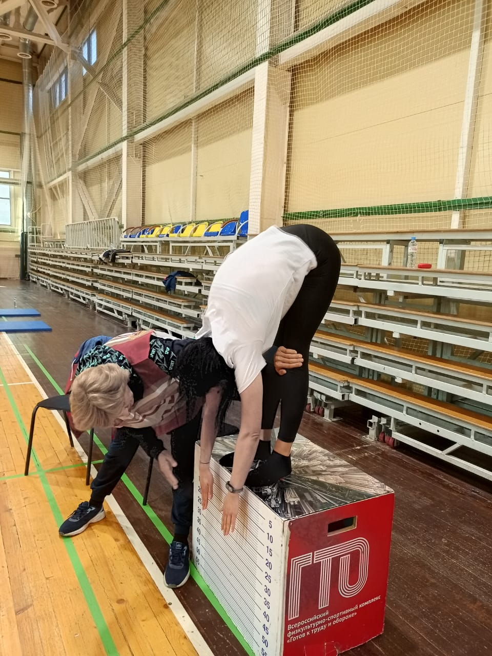 - наклон вперёд из положения стоя на гимнастической скамейке (с прямыми ногами);