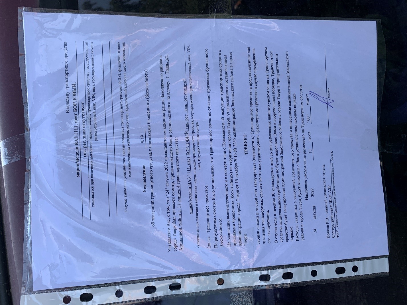 В соответствии с Положением об эвакуации транспортных средств с признаками брошенных (бесхозяйных) на территории города Твери, утвержденного постановлением администрации города Твери от 15 декабря 2015 № 2255, собственнику транспортного средства марки ВАЗ 1111, БОРДОВОГО цвета, регистрационный знак отсутствует, расположенного в районе д. 11 корп. 4 на ул. Артюхиной г. Твери, необходимо своими силами и за свой счет эвакуировать (переместить) транспортное средство в предназначенное для хранения транспортных средств место или утилизировать транспортное средство в случае прекращения его эксплуатации.