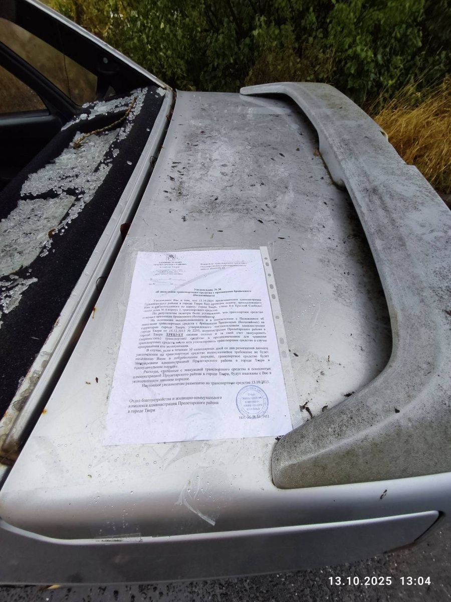 Администрация Пролетарского района в городе Твери на основании Постановления администрации города Твери от 15.12.2015 № 2255 «Об утверждении Положения об эвакуации транспортных средств с признаками брошенных (бесхозяйных) на территории города Твери» информирует, что 13.10.2025 представителем администрации Пролетарского района в городе Твери проведен осмотр транспортного средства с государственным регистрационным знаком Н105ОХ 69, расположенного около дома № 4 корпус 1 на улице 8-я Красной Слободы города Твери. Транспортное средство находится в разукомплектованном состоянии, отсутствуют стекла, имеется свободный доступ в салон.