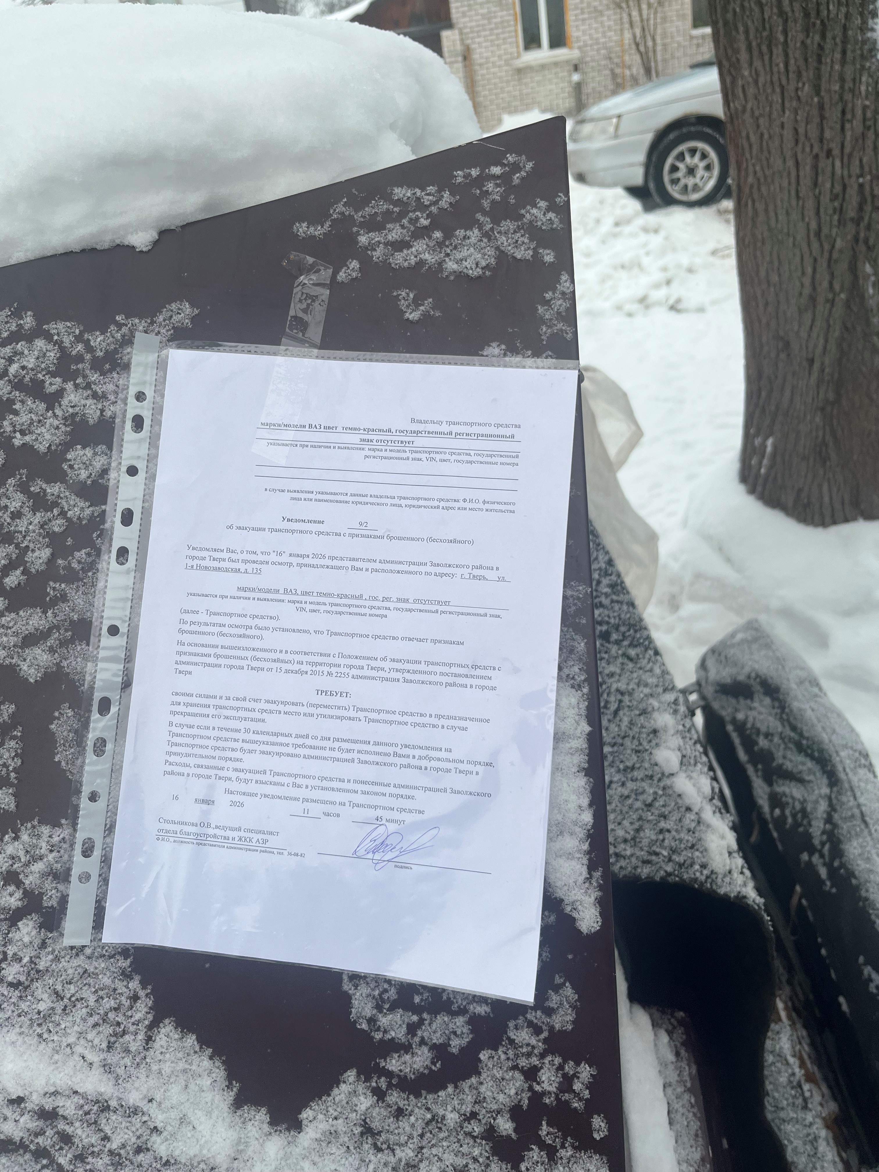 В соответствии с Положением об эвакуации транспортных средств с признаками брошенных (бесхозяйных) на территории города Твери, утвержденного постановлением Администрации города Твери от 15 декабря 2015 № 2255, собственнику транспортного средства марки ВАЗ, цвет темно-красный, расположенного по адресу: г. Тверь, ул. 1-я Новозаодвская, д. 135, необходимо своими силами и за свой счет эвакуировать (переместить) транспортное средство в предназначенное для хранения транспортных средств место или утилизировать транспортное средство в случае прекращения его эксплуатации.