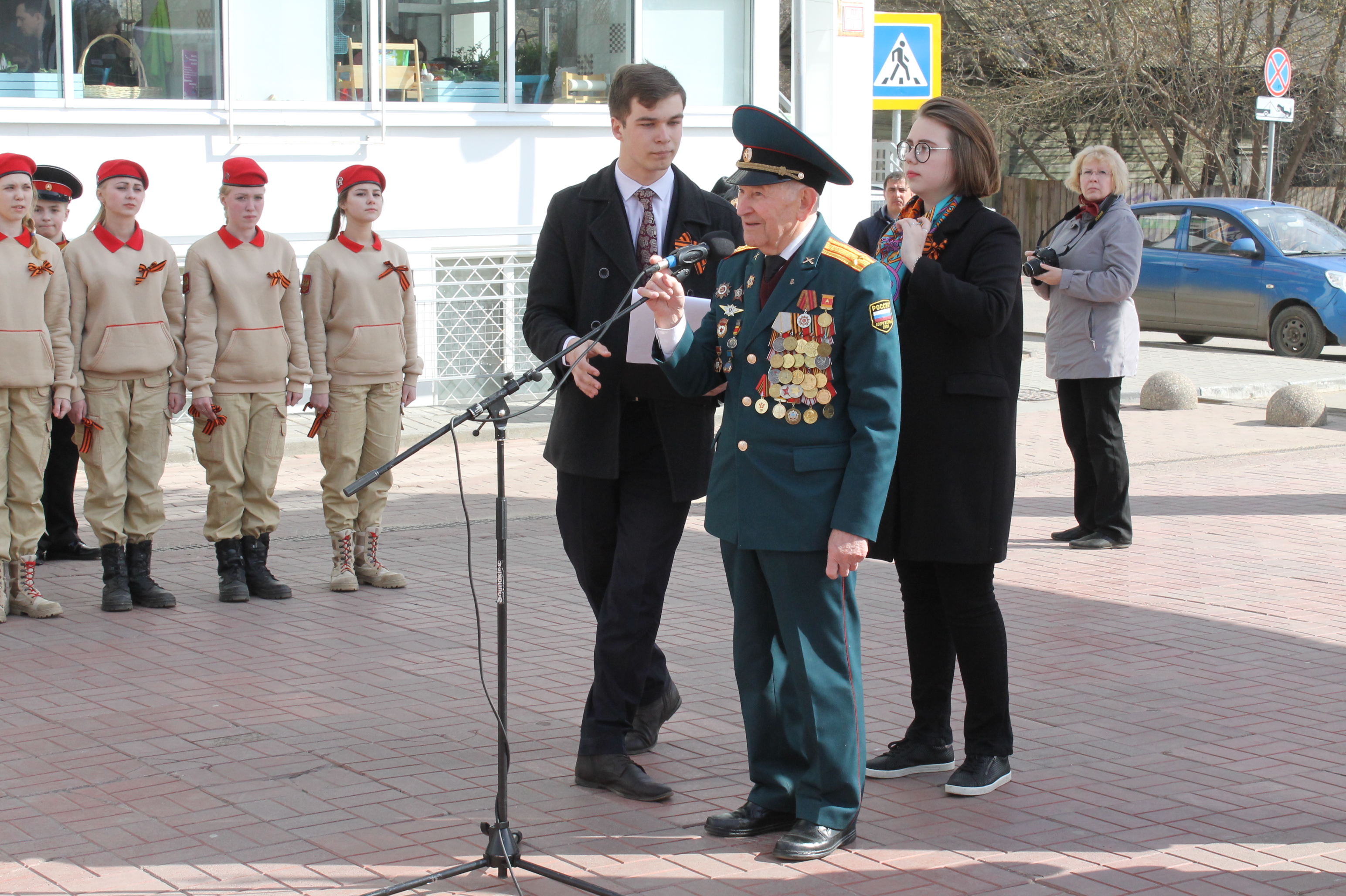 В Твери в торжественной церемонии старта городского этапа Всероссийской акции «Георгиевская ленточка» приняли участие студенты и учащиеся учебных заведений города Твери, волонтёры, представители молодёжных общественных организаций, а также ветераны Великой Отечественной войны. Один из них – участник Ржевской битвы, Почётный гражданин города Твери Иван Кладкевич – обратился к собравшимся: