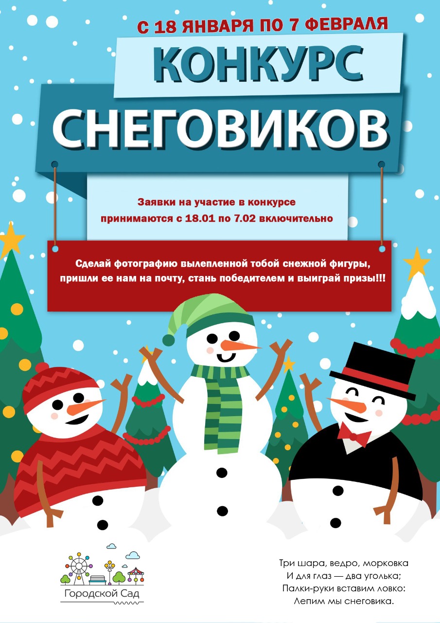 Заявки на участие в конкурсе принимаются с 18 января до 7 февраля по электронной почте: gorsad.tver@bk.ru. Количество заявок не ограничено. Конкурсные работы будут оцениваться в трех номинациях: «Классический снеговик», «Самый большой снеговик», «Самый оригинальный снеговик». В каждой из них будет выбран победитель. Подведение итогов конкурса и награждение состоится 10 февраля.