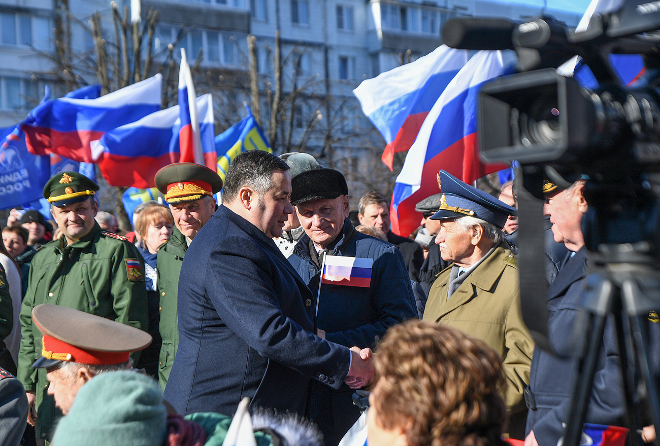 18 марта в Твери прошла акция «Россия. Крым. Донбасс», приуроченная ко Дню воссоединения Крыма и Севастополя с Россией. Участие в событии приняли Губернатор Игорь Руденя, фронтовики Спартак Андреевич Сычев и Иван Евгеньевич Кладкевич, главный федеральный инспектор по Тверской области Игорь Жуков, председатель Законодательного Собрания Тверской области Сергей Голубев, сенаторы РФ Андрей Епишин и Людмила Скаковская, депутаты Государственной Думы РФ Сергей Веремеенко и Юлия Саранова, суворовцы и курсанты академии ВКО, волонтеры, юнармейцы и общественники, жители областной столицы.