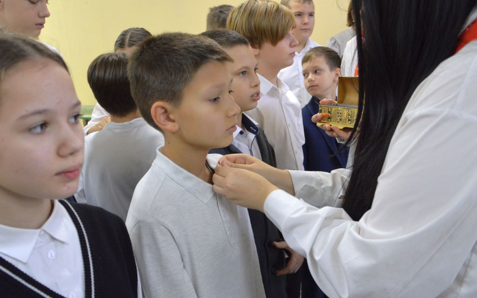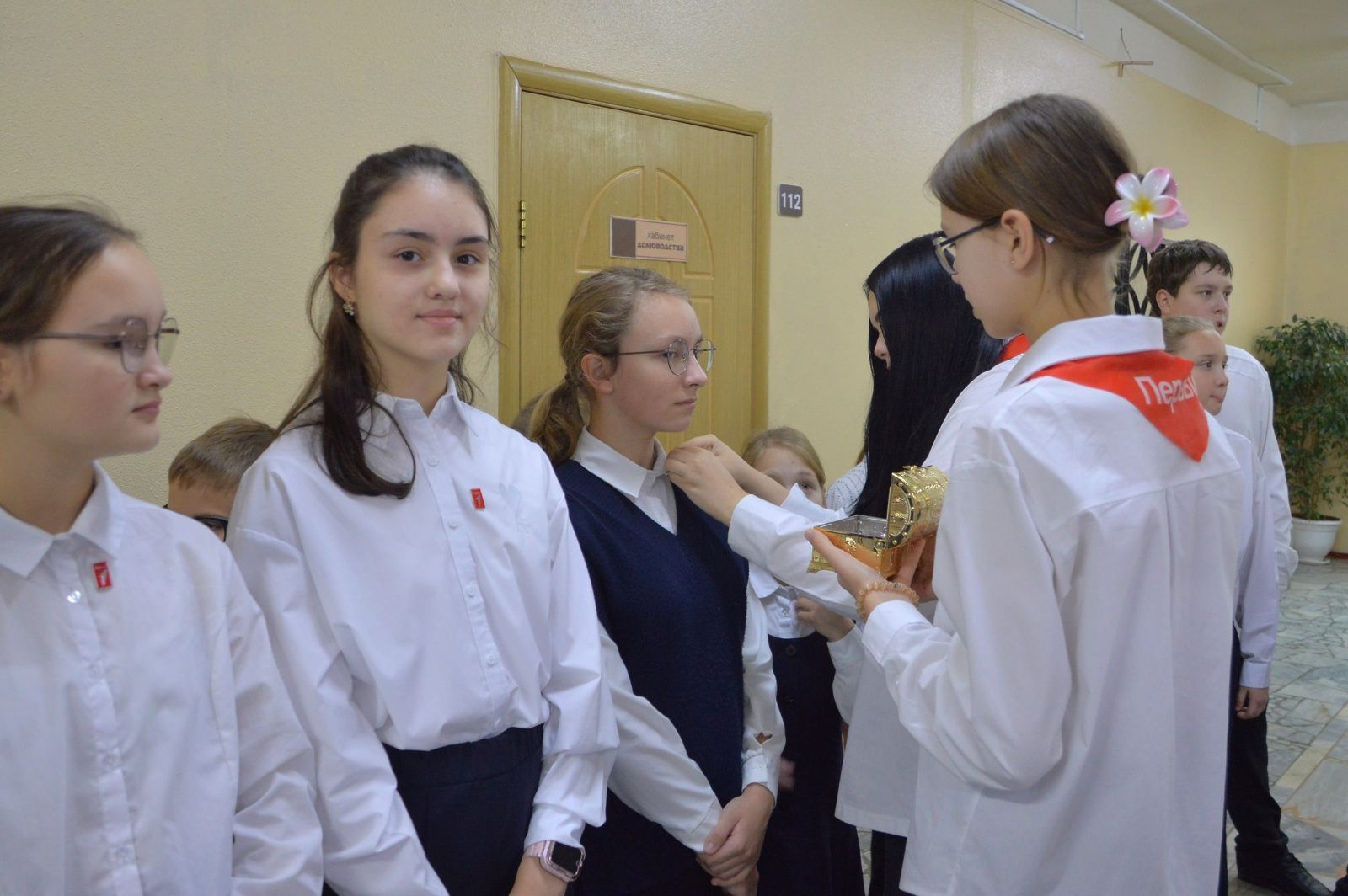 Всем участникам были вручены знаки отличия, которые принято носить как символ чести и достоинства. Вступая в ряды «Движения первых», школьники могут проявить себя, участвуя в проектах по одному или нескольким из 12 направлений: