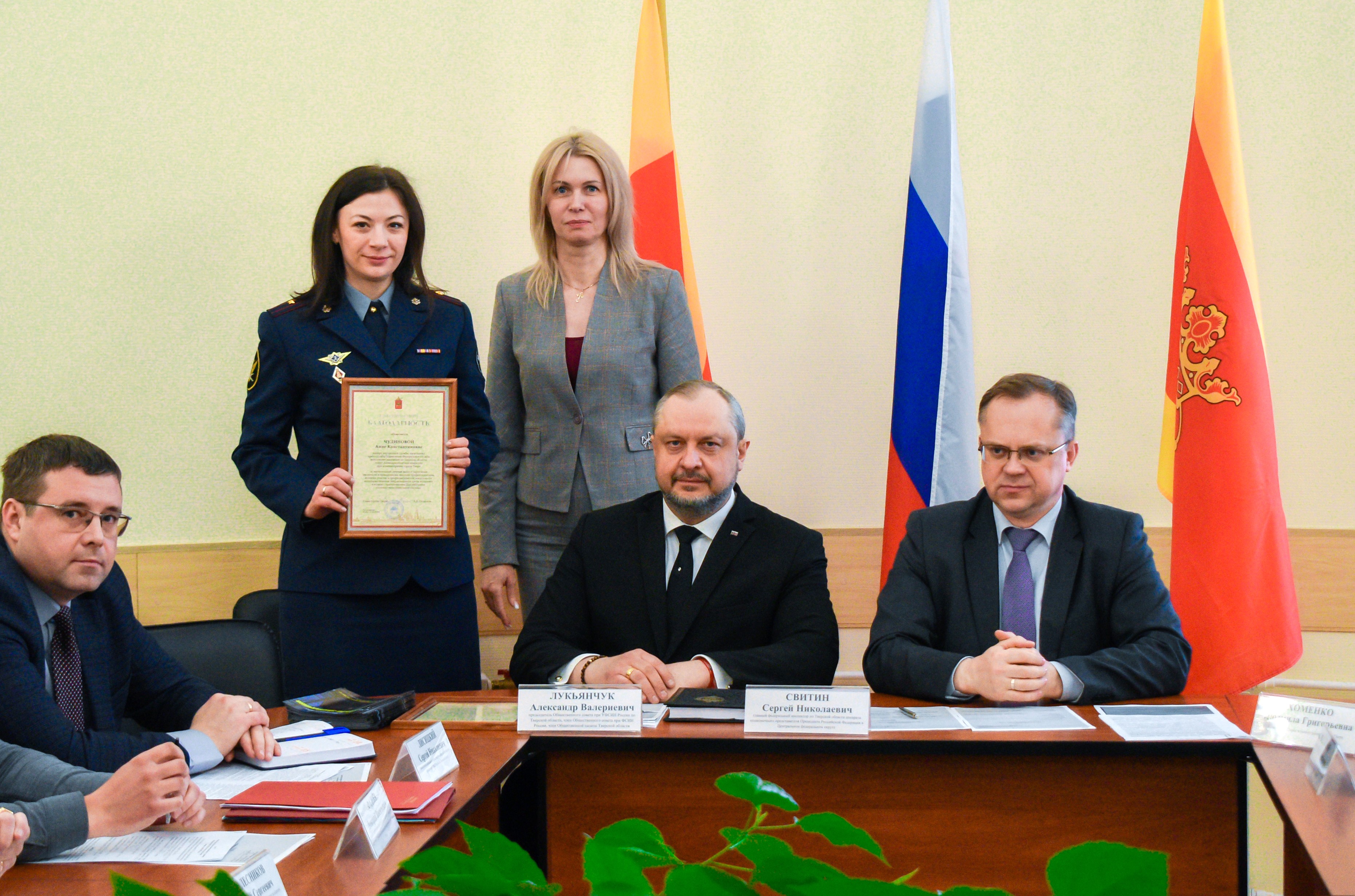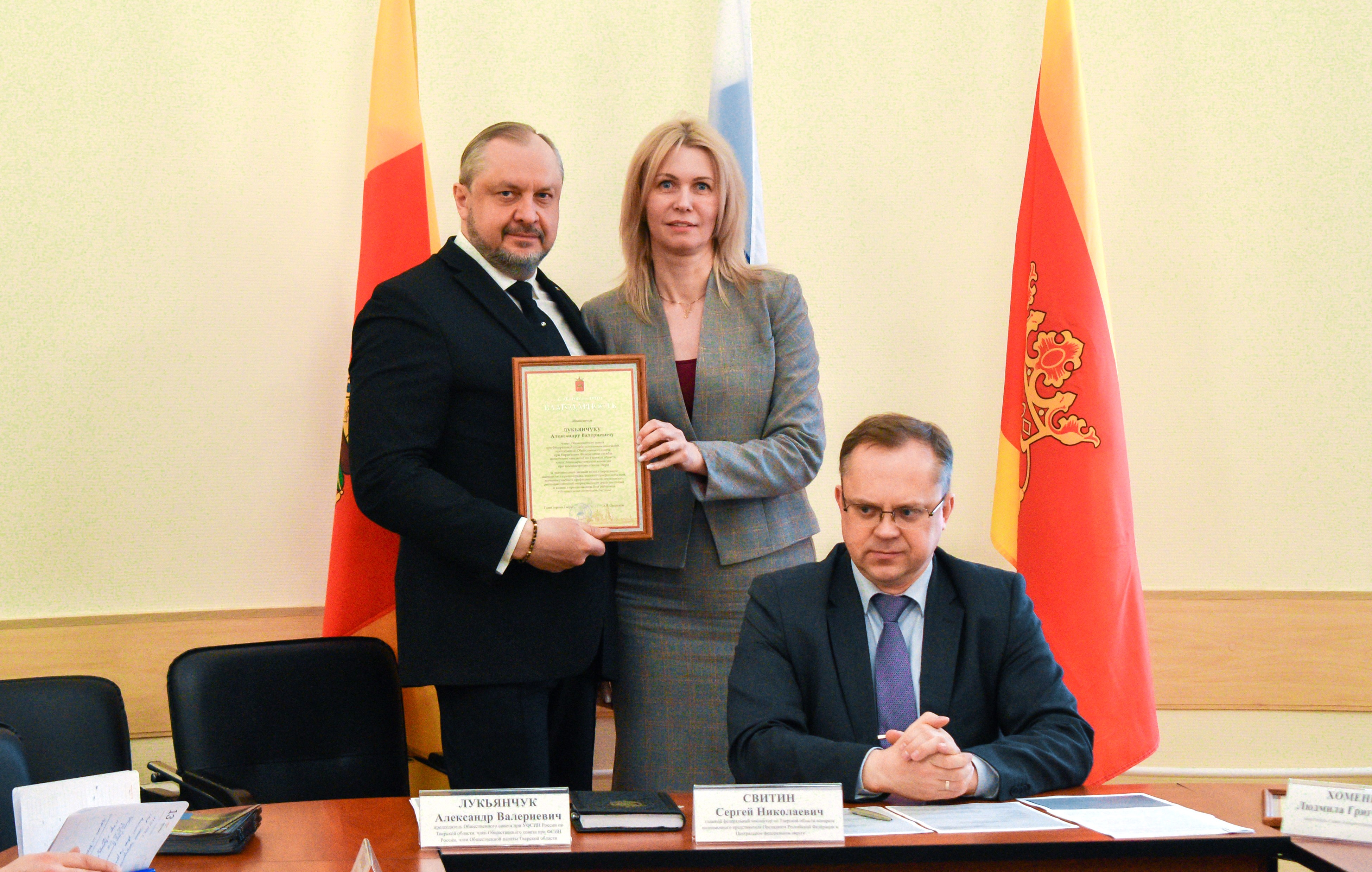 В рамках заседания состоялось награждение отличившихся участников городской Антинаркотической комиссии в профилактической деятельности. За профессионализм, значительный личный вклад в укрепление законности и правопорядка на территории города, активное участие в просветительских антинаркотических проектах для подростков и молодежи благодарности Главы города Твери Алексея Огонькова вручены члену Общественной палаты Тверской области, председателю Общественного совета при УФСИН России по Тверской области Александру Лукьянчуку и начальнику пресс-службы УФСИН России по Тверской области Анне Чудиновой.